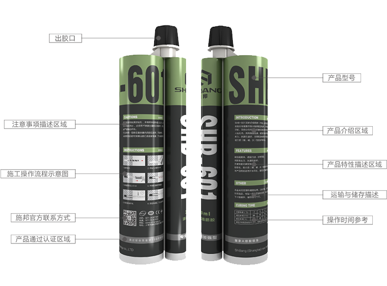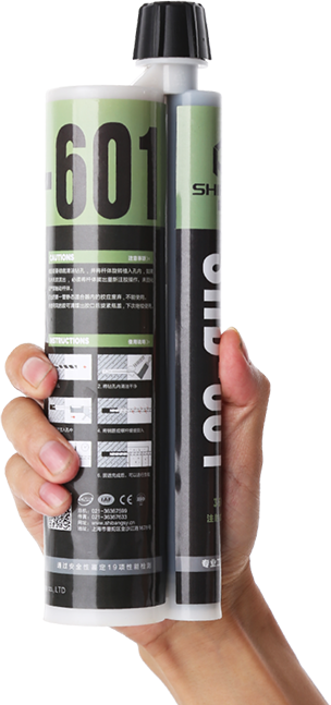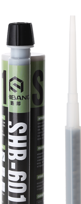 SHB-601注射式植筋膠(專業工程加強型)係A、B組分高強複合型環氧樹脂(zhī)膠粘劑,使用專用的注射槍(qiāng)注射,兩組(zǔ)分在可更換的(de)靜態混合器中充分混合直(zhí)接注(zhù)入鑽孔內