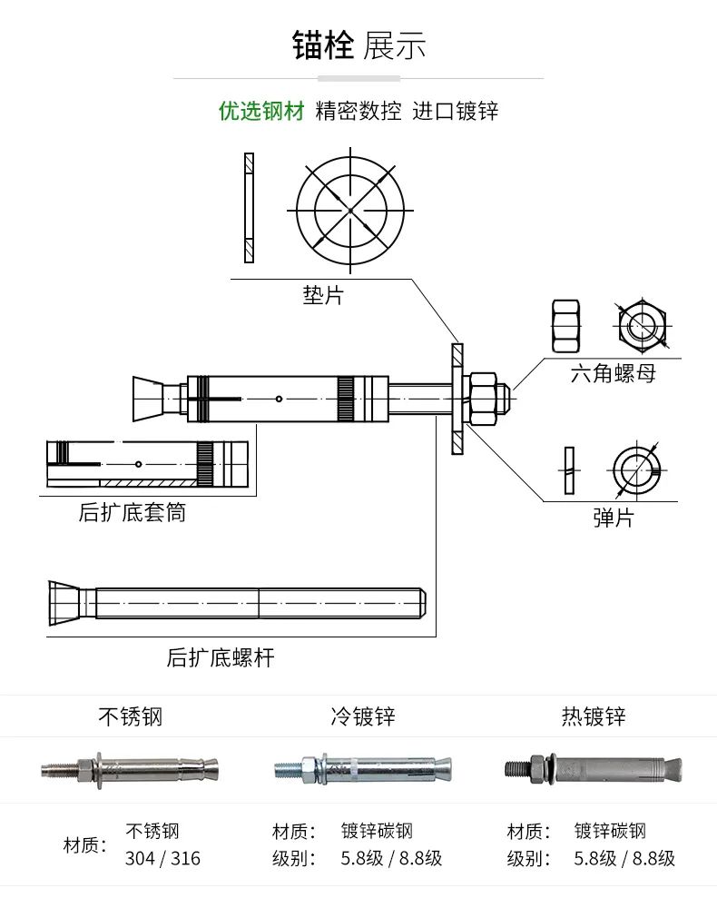 機(jī)械錨栓的材質有不鏽鋼材質和碳鋼材質區分,不鏽(xiù)鋼鋼材(cái)質是(shì)分為304不鏽鋼和316不鏽鋼;而碳鋼材質的主要(yào)區別是在鍍鋅上,分為冷鍍鋅和熱鍍鋅(xīn)碳鋼。冷鍍鋅和熱鍍鋅機械(xiè)錨栓,均有5.8 級 /8.8 級