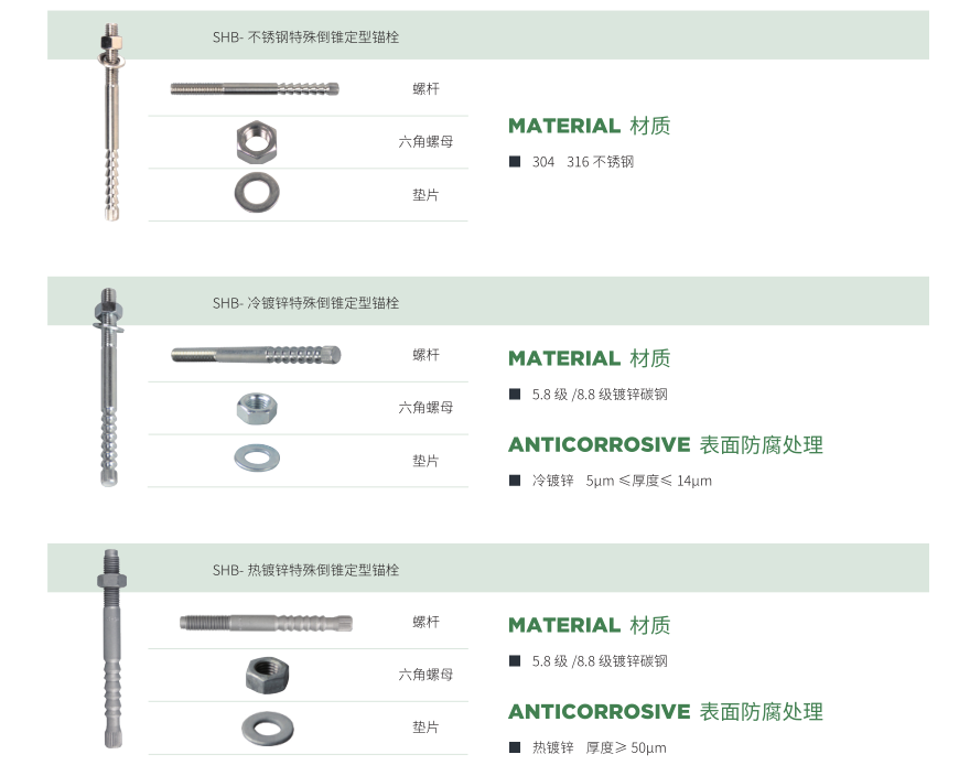 定型錨栓也(yě)稱特殊倒錐形錨栓、特殊倒錐膠粘型錨栓。由螺杆、平墊、螺母組成,通過化學粘結劑保證錨栓與混凝土體的粘結強(qiáng)度。需配合施(shī)邦注(zhù)射式植筋膠使用。